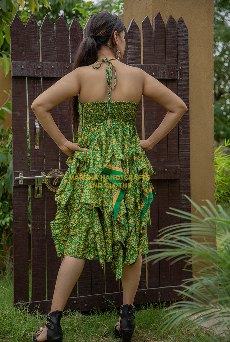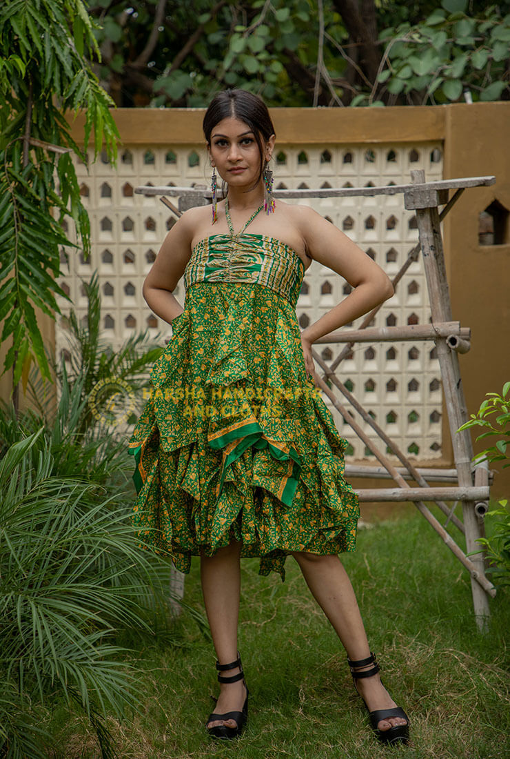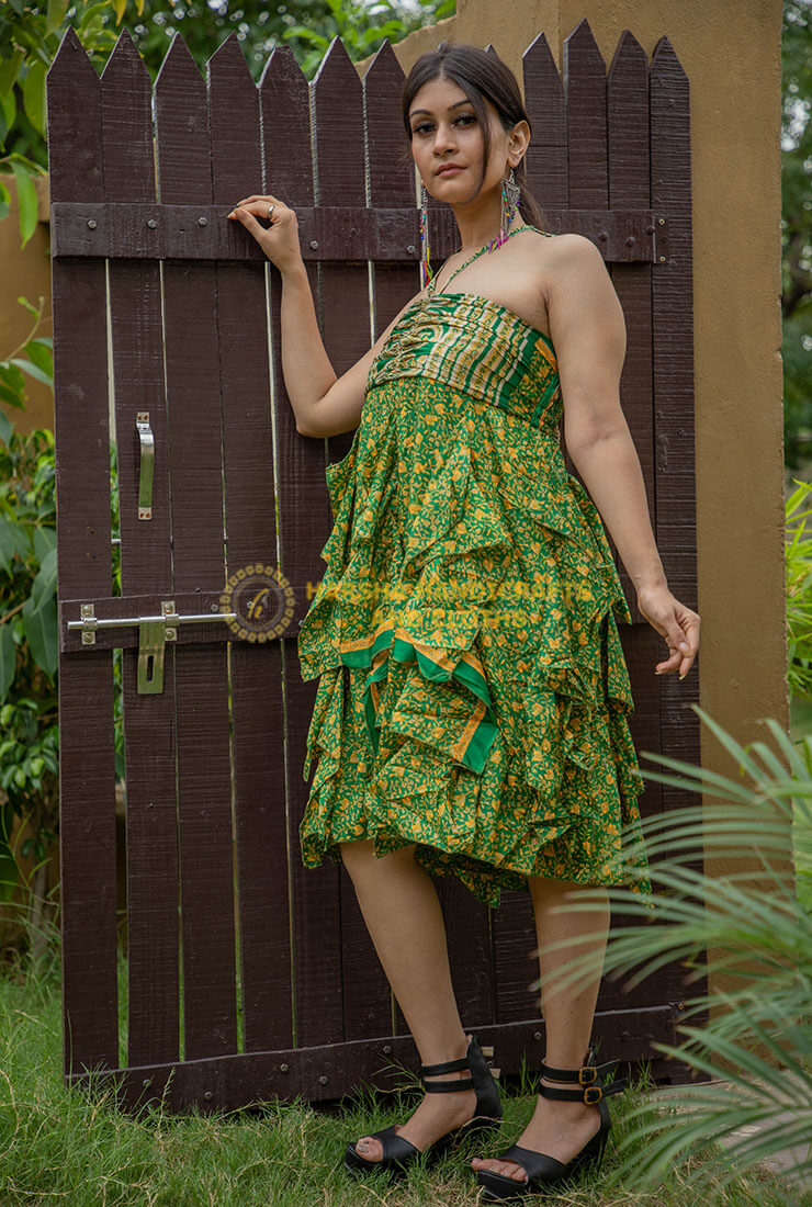 Funkey string adjuster short dress made in Silk-Polyester recycled/used Saree fabric