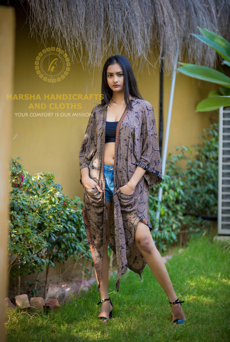 Short Kimono With Pocket made in Silk-Polyester recycled/used Saree fabric