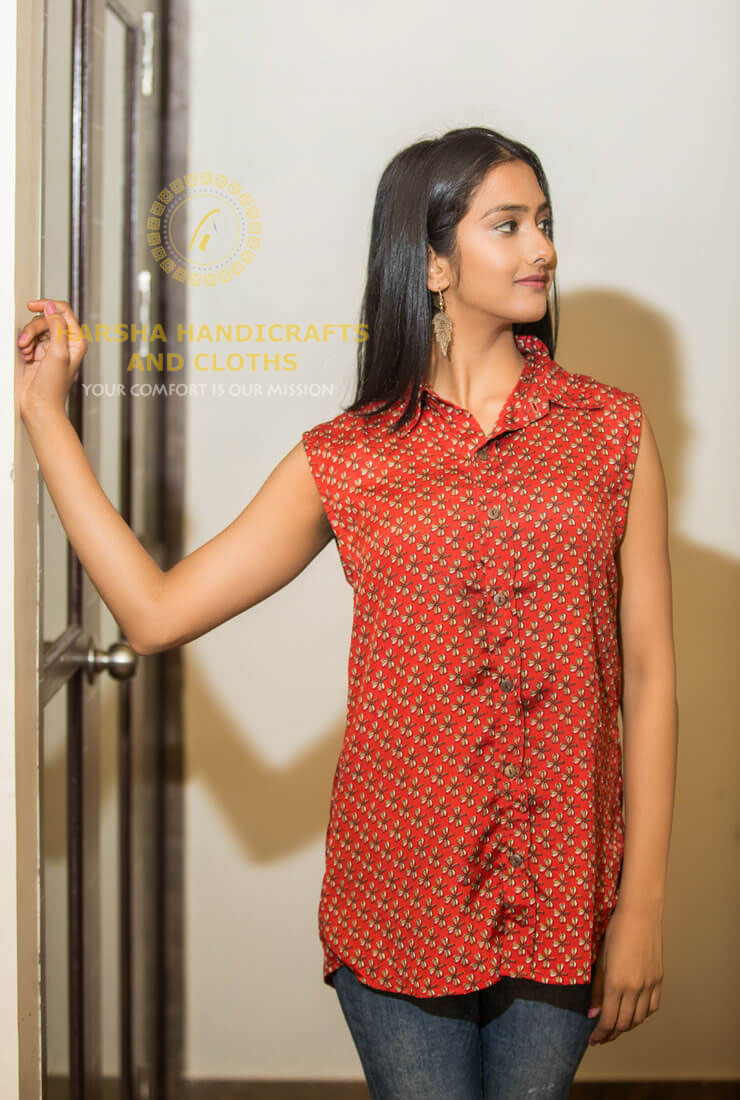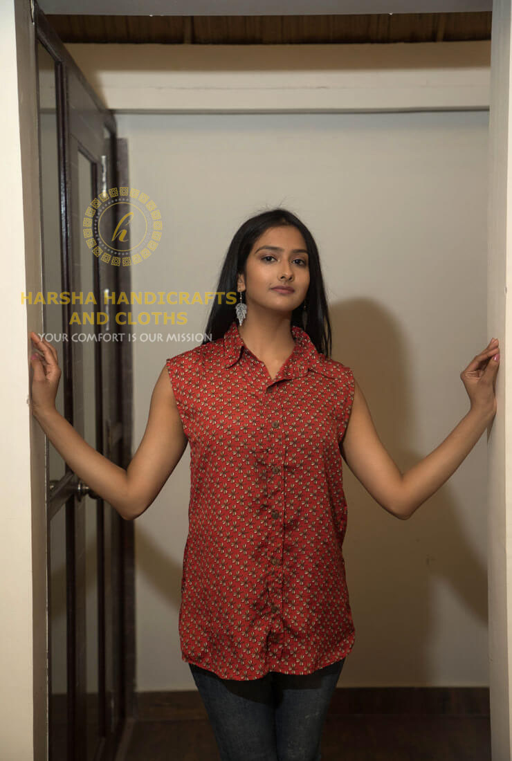 Sleeveless Shirt made in Silk-Polyester recycled/used Saree fabric